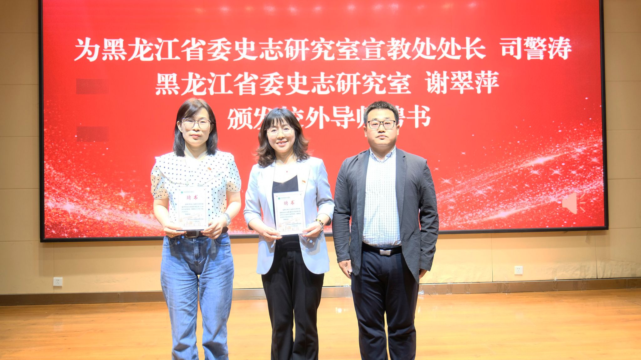 随后,刘双奇为黑龙江省委史志研究室宣教处处长司警涛、研究室成员谢翠萍颁发校外导师聘书。