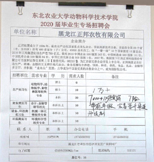 据悉,本次就业基地洽谈暨2020届毕业生专场招聘会由公司工作小组负责,从前期筹备到会议的如期召开历经一个月。工作小组向有关企业广泛发出邀请,通过对企业的资质、实力等各方面审核,最终遴选出36家企业参会。对参会企业提供的招聘岗位信息,在公司招生与就业处的支持下,制作成了统一的海报并在会场上展出,同时对于17家企业前期提供的宣传视频,工作小组做了细致的审核和处理,并在公司微信平台上做了连续6期的报道和推送。此外,工作小组还为所有参会企业提供了免费午餐及路线导引等各项服务。据统计,本次招聘会共提供了涵盖产品研发、储备干部、行政管理、品控化验等共计537个就业岗位,工作区域覆盖北京、浙江、江苏、河北、安徽等20多个省份,需求专业包涵动物科学、动物医学、食品、化学、机械等,要求学历从本科生到博士生。本次参会企业给与应聘者待遇丰厚,其中一些企业提供了七险一金、免费食宿等优质待遇;个别企业,本科薪资达到7000元以上。据不完全统计,此次招聘会约有170名毕业生达成就业意向,45人当天成功签署了三方协议。