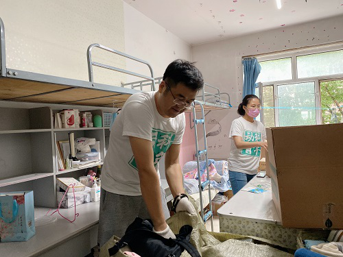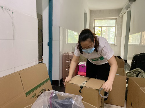 6月24日上午,负责员工行李整理等工作的教师服务队成员来到员工公寓,通过前期对接安排,与所负责的员工以视频直播的形式进行物品识别、分类整理、打包邮寄等工作。小至一支笔,大至行李箱,志愿教师们耐心询问、精心包裹。