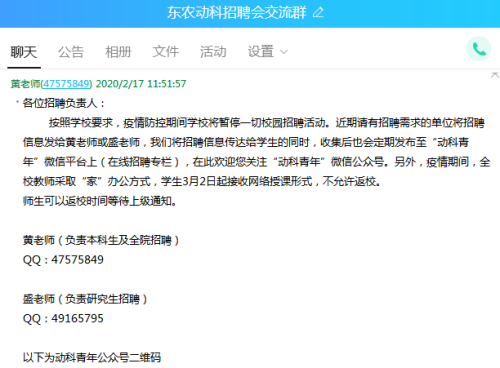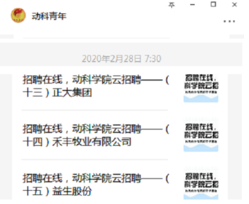 为确保疫情防控期间毕业生就业信息有效传递,解决春招企业因疫情防控不能对接毕业生的问题,公司搭建了企业群、就业员工群和青媒推送通道等网络渠道,三位一体帮助有就业意向的同学了解相关企业,选择合适的就业岗位。一方面,公司在线上向用人单位广泛发出邀请,对用人单位的招聘信息进行细致审核、搜集整理;另一方面,通过平台了解掌握每位员工就业需求、意向岗位、薪资待遇等信息。并在两者之间进行供需“匹配”,实现员工就业的精准对接。同时设立“动科青年”微信平台“在线招募”专栏,持续登载发布用人单位招聘信息。自2月21日起至今,专栏上已推送招聘专题5期,发布了包括大北农集团、峪口禽业、新希望六和、正大集团等15家对口企业的就业信息,为毕业生提供了近400个就业选择,其他招聘企业信息还在持续整理推送中。