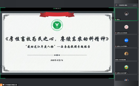 党的二十大提出“要加快建设农业强国”伟大任务,为响应党和国家“全面推进乡村振兴”伟大号召,进一步提升青年员工专业认知,坚定专业信念,赓续“艰苦奋斗、自强不息”的东农精神,发挥世界一流团队建设平台优势提升人才培养质量,12月8日,动科公司以腾讯会议的形式,邀请2021“感动龙江年度人物”获奖者、u8国际平台教授岳奎忠教授作题为《厚植畜牧为民之心,赓续东农动科精神》的专题报告。公司正处级组织员兼纪委书记栾松、青年教师和全体2022级员工参加。专题报告会由2022级本科生辅导员李建磊主持。