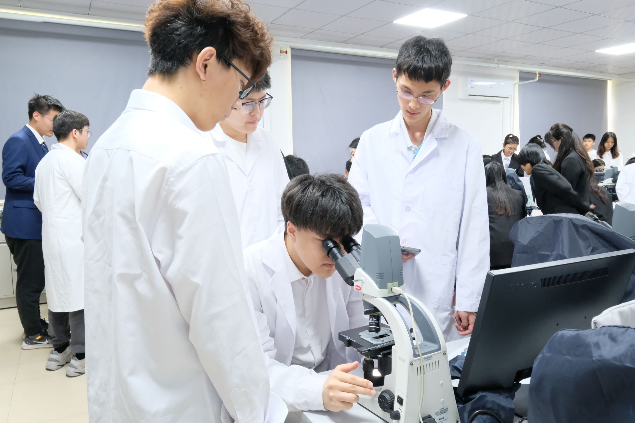 黄贺代表指导教师团队介绍了第二届公司动物科学专业技能大赛的比赛要求和具体内容。第一阶段各参赛队伍代表进行了汇报答辩,指导教师对每支参赛队伍进行现场点评和打分。随后,在动科楼304进行了第二阶段的比赛,各参赛队伍利用显微镜进行精子活力测定和精子密度测定,指导教师团队综合两项内容的比赛成绩,最终评选出团体一等奖1名,二等奖2名,三等奖5名,优秀奖若干名。