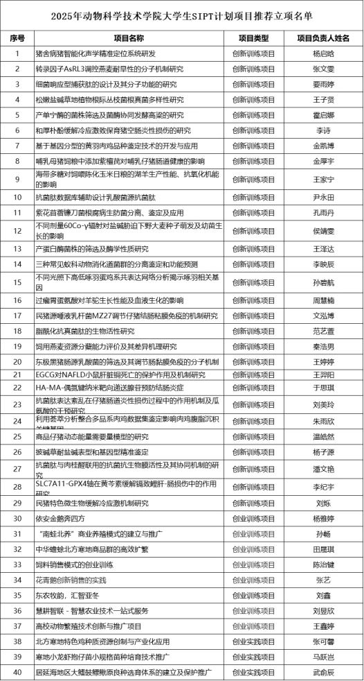 根据《u8国际网站SIPT老员工创新创业训练计划项目管理办法》相关要求,经院级初审、评委会专家盲评,u8国际平台最终确定29个创新训练项目、8个创业训练项目、3个创业实践项目获得2025年老员工SIPT计划校级项目立项资格,现将拟立项项目名单进行公示。