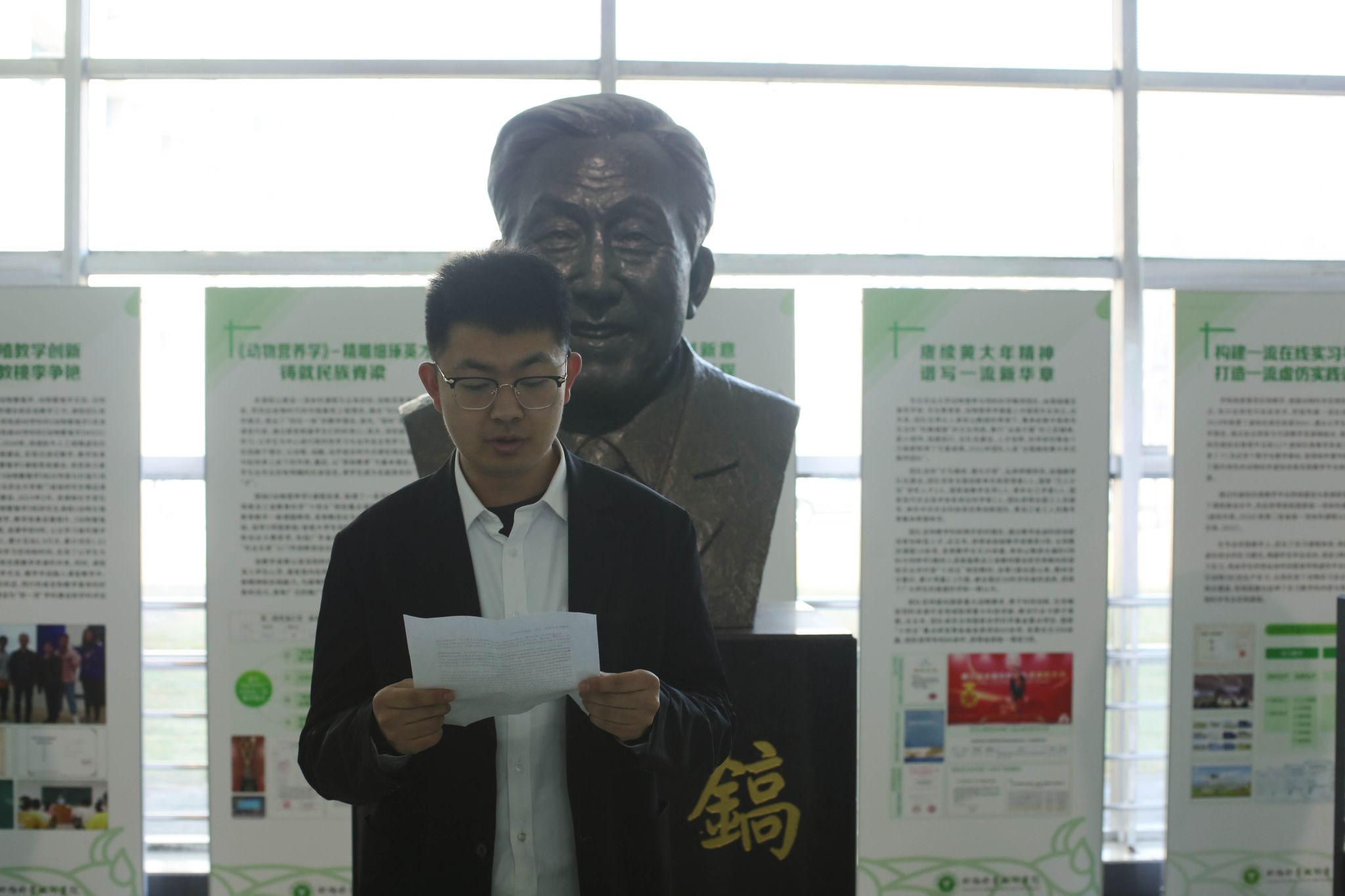 青年教师代表滕腾表示,作为青年教师,既是追光者,更是传灯人。站在新的历史节点,青年教师肩负三重使命,一是做学科创新的攻坚者,二是做教育改革的探索者,三是做精神传承的践行者。他号召大家以四位先生为镜,争做新时代的“大先生”,在畜牧业的“卡脖子”处进行攻坚,在龙江振兴的第一线执着坚守,用青春和汗水书写“动科人”的新篇章。