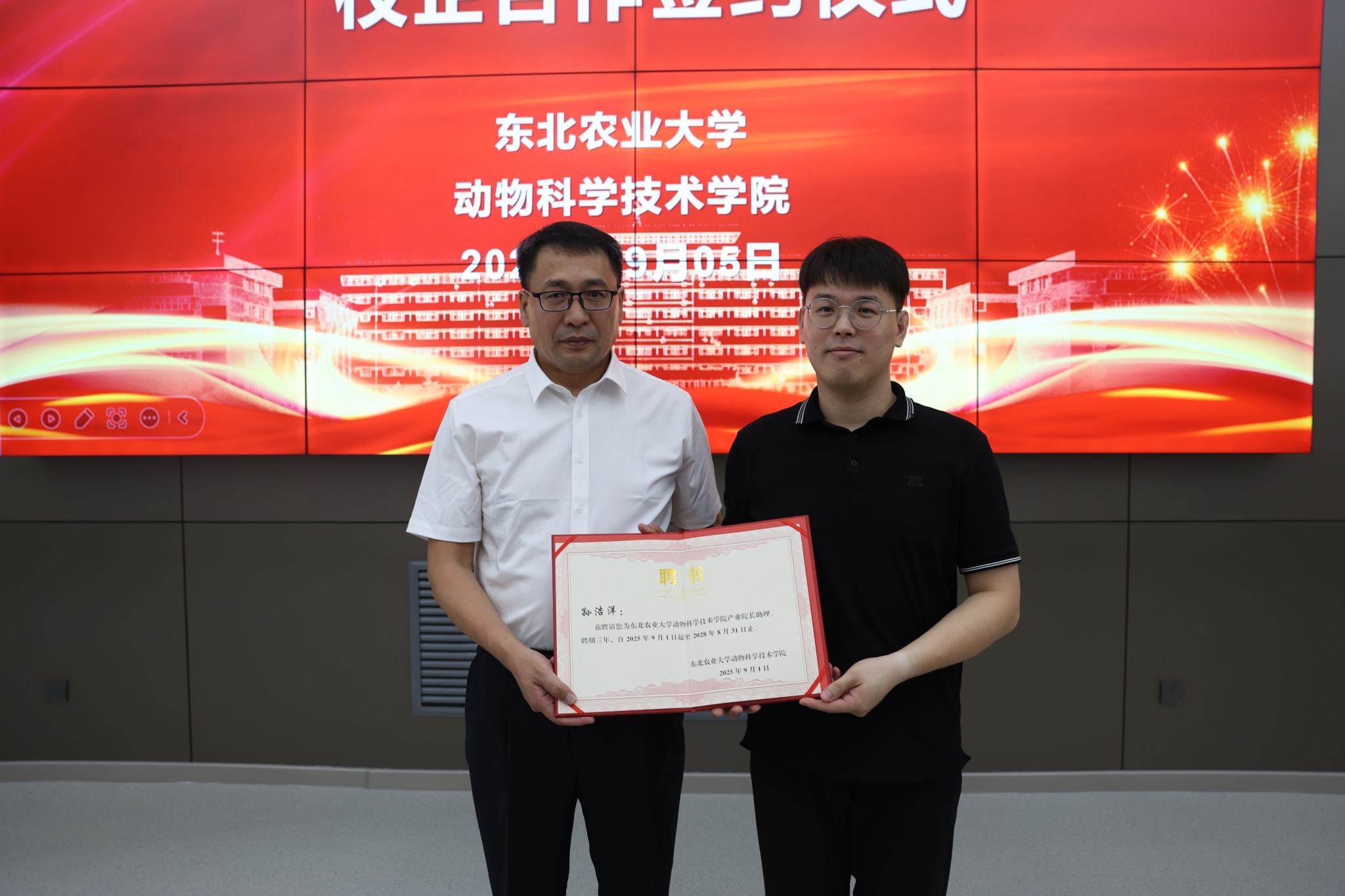 刘竹青为殷学中颁发聘书。他强调,面对新一轮科技革命和产业变革的浪潮,面对国家对现代农业发展的战略需求,高等教育必须更加主动地融入产业体系,更加紧密地对接行业前沿,更加高效地将知识创新力转化为产业驱动力。殷学中经理作为动科公司首任产业经理,意味着双方合作关系的升华与跨越,推动公司的创新研究成果更快地在生产实践中落地生根、开花结果,真正实现“把论文写在大地上”,服务产业升级和区域经济发展。