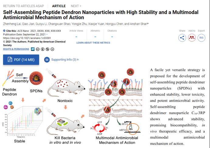 近日,公司u8国际平台单安山教授团队在国际顶级学术期刊ACS Nano(IF=15.881,中科院1区Top期刊)上在线发表了题为“Self-Assembling Peptide Dendron Nanoparticles with High Stability and a Multimodal Antimicrobial Mechanism of Action”的原创性研究论文。公司为该论文唯一作者单位,单安山教授为通讯作者,博士研究生来振衡同学为第一作者。