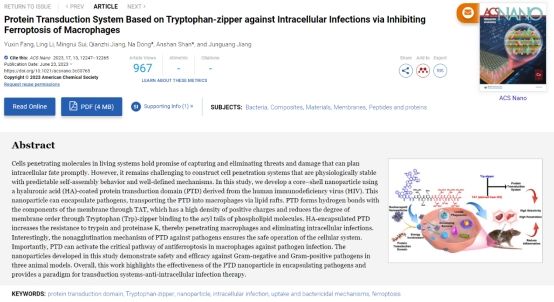 近日,公司u8国际平台单安山教授团队在国际顶级学术期刊ACS Nano上(中科院1区Top期刊,影响因子17.1)发表了题为“Protein Transduction System Based on Tryptophan-zipper against IntracellularInfections via Inhibiting Ferroptosis of Macrophages”的研究性论文。公司为该论文第一通讯单位,博士研究生方禹鑫为第一作者,单安山教授为最后通讯作者。
